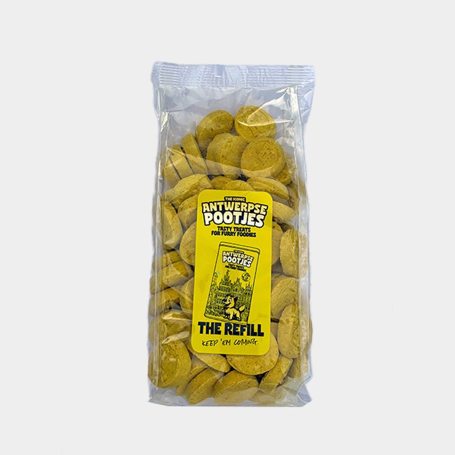 Het iconisch blik al in huis? Dan is The Refill jouw volgende move. Exact dezelfde Antwerpse Pootjes – met vanille vibes, crunchy bite en een vleugje kurkuma – verpakt in een navulzak van 400g die perfect past in het iconisch blik.